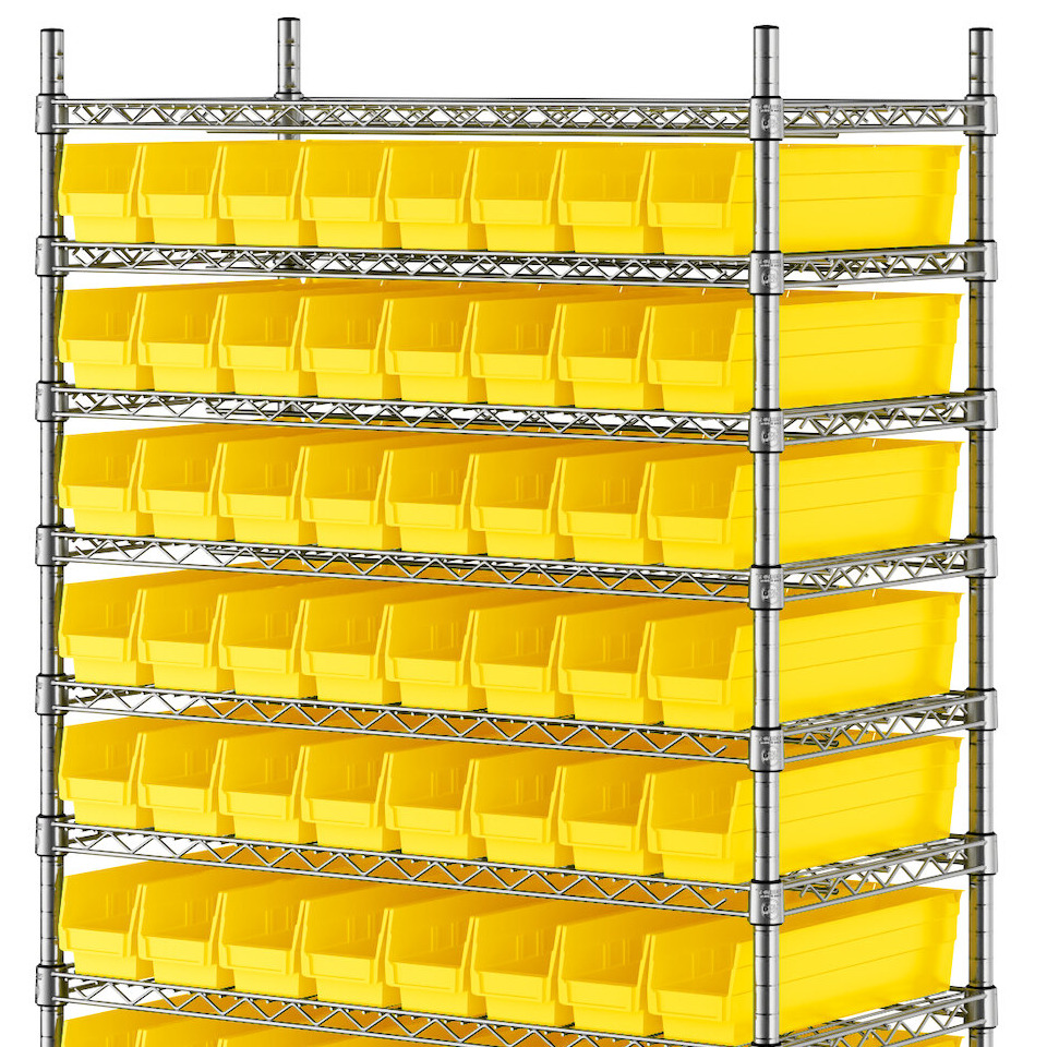 - Includes 12 shelves, 4 posts, and 88 yellow polypropylene bins