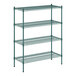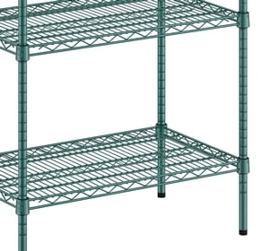 This kit boasts a green epoxy coated wire construction that works well in back-of-house storage and supply areas. Since it resists corrosion from humidity, this shelving unit is a great choice for walk-in coolers, storage rooms, or dish rooms. Its wire shelves do a great job of facilitating proper air flow around your stored supplies, helping to prolong the shelf life of food.