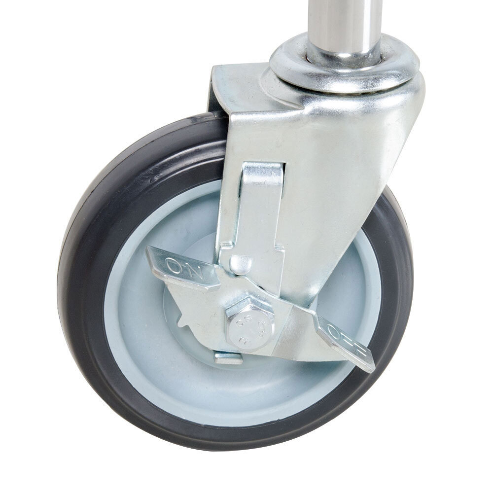This cart comes with (4) 5" polyurethane casters that make it easy for you to maneuver the cart around your establishment. Two of the included casters also have brakes.