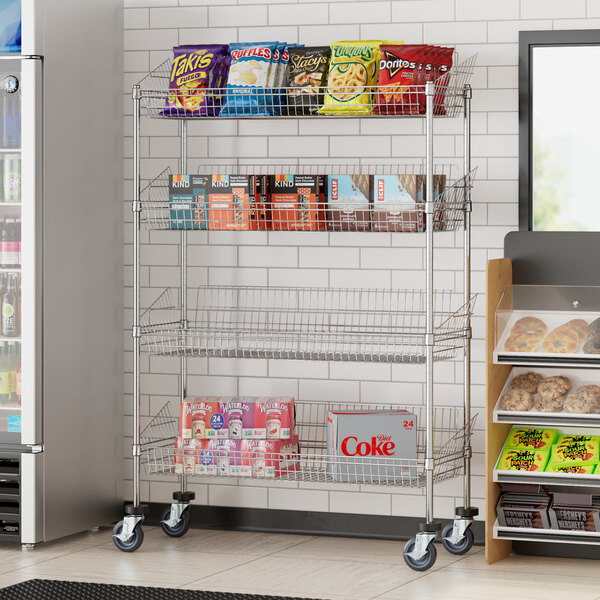 View All ItemsStore and display items at your bakery, produce stand, or gift shop using this Regency 18" wide chrome mobile 4 post basket storage display stand!
