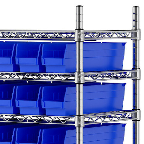 The NSF shelving unit is made of a durable, chrome-plated metal with a clear epoxy coating. It includes 12 shelves, 4 posts, and 110 blue injection-molded polypropylene bins, all of which are made to commercial-grade specifications to withstand industrial conditions and for your business's long-lasting use. Each shelf can hold up to an impressive 600 lb. of evenly distributed weight.
