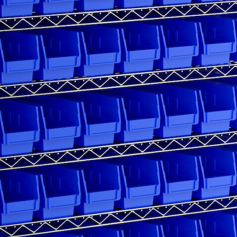 - Includes 12 shelves, 4 posts, and 110 blue polypropylene bins