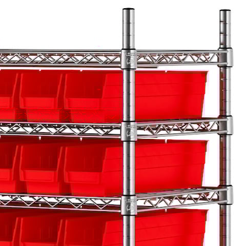 The NSF shelving unit is made of a durable, chrome-plated metal with a clear epoxy coating. It includes 12 shelves, 4 posts, and 110 red injection-molded polypropylene bins, all of which are made to commercial grade specifications to withstand industrial conditions and for your business's long-lasting use. Each shelf can hold up to an impressive 600 lb. of evenly distributed weight.