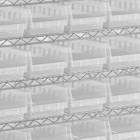 - Includes 12 shelves, 4 posts, and 66 clear polypropylene bins