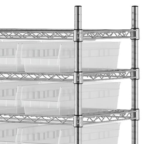 The NSF shelving unit is made of a durable, chrome-plated metal with a clear epoxy coating. It includes 12 shelves, 4 posts, and 66 clear injection-molded polypropylene bins, all of which are made to commercial-grade specifications to withstand industrial conditions and for your business's long-lasting use. Each shelf can hold up to an impressive 600 lb. of evenly distributed weight.