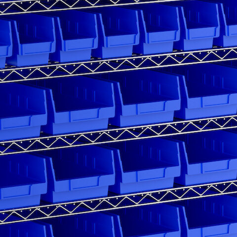 - Includes 12 shelves, 4 posts, and 91 blue polypropylene bins