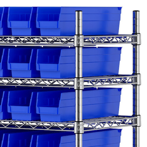The NSF shelving unit is made of a durable, chrome-plated metal with a clear epoxy coating. It includes 12 shelves, 4 posts, and 91 blue injection-molded polypropylene bins, all of which are made to commercial-grade specifications to withstand industrial conditions and for your business's long-lasting use. Each shelf can hold up to an impressive 600 lb. of evenly distributed weight.