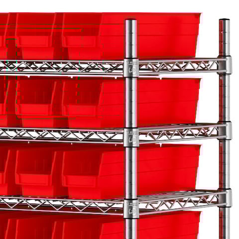 The NSF shelving unit is made of a durable, chrome-plated metal with a clear epoxy coating. It includes 12 shelves, 4 posts, and 91 red injection-molded polypropylene bins, all of which are made to commercial grade specifications to withstand industrial conditions and for your business's long-lasting use. Each shelf can hold up to an impressive 600 lb. of evenly distributed weight.