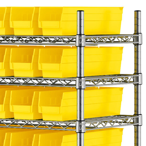 The NSF shelving unit is made of a durable, chrome-plated metal with a clear epoxy coating. It includes 12 shelves, 4 posts, and 91 yellow injection-molded polypropylene bins, all of which are made to commercial-grade specifications to withstand industrial conditions and for your business's long-lasting use. Each shelf can hold up to an impressive 600 lb. of evenly distributed weight.