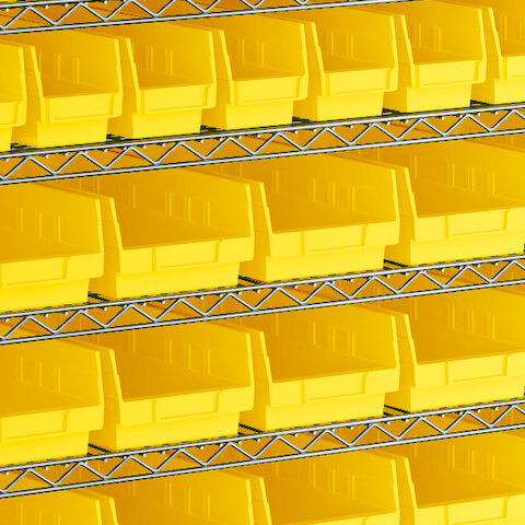- Includes 12 shelves, 4 posts, and 91 yellow polypropylene bins