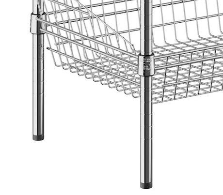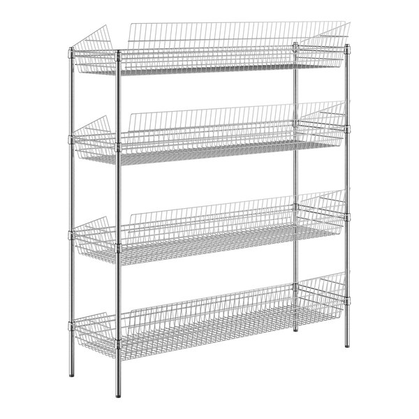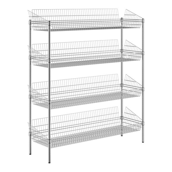 This unit features 4 storage display baskets with a drop front and sloped sides to help prevent your products from falling out. With an open wire design, these shelves ensure proper air flow around your stored supplies, products, or ingredients.