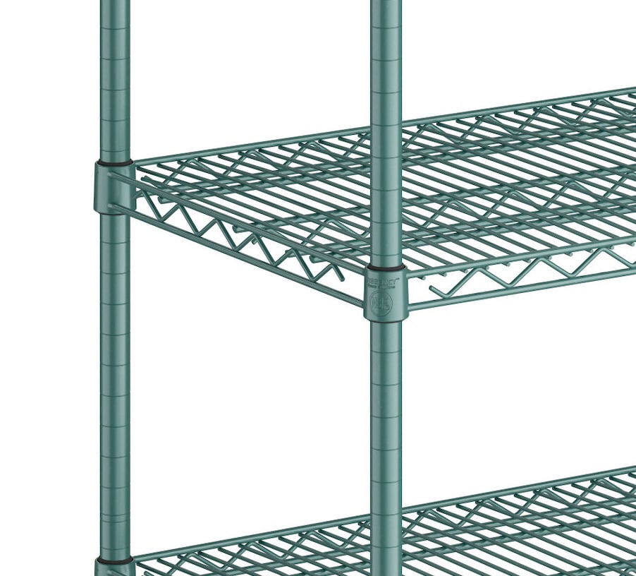 Since this shelving unit has a green epoxy coating for increased longevity, it's the perfect choice for use in any storage or display environment, including moist ones because it is corrosion-resistant. This kit boasts an attractive wire construction that works well in front-of-house merchandising as well as display spaces in your boutique, market, or other business venue.