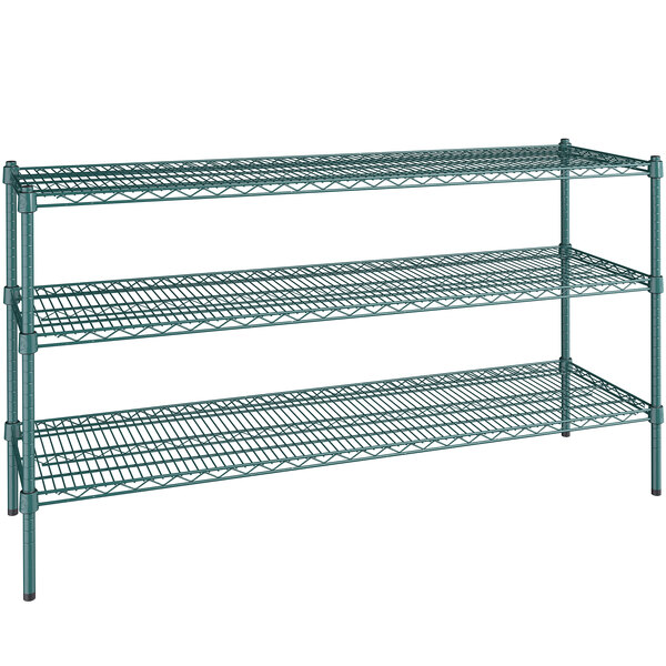 This kit boasts a green epoxy coated wire construction that works well in back-of-house storage and supply areas. Since it resists corrosion from humidity, this shelving unit is a great choice for walk-in coolers, storage rooms, or dish rooms. Its wire shelves do a great job of facilitating proper air flow around your stored supplies, helping to prolong the shelf life of food.