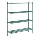This shelving unit features a rugged green epoxy construction for maximum longevity. Plus, its shelves have rugged square tubing combined with a removable wire mat, ensuring a long-lasting, reliable storage solution for your business.