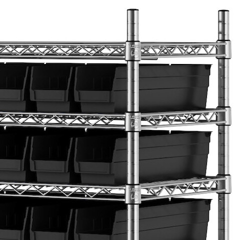 The NSF shelving unit is made of a durable, chrome-plated metal with a clear epoxy coating. It includes 12 shelves, 4 posts, and 118 black injection-molded polypropylene bins, all of which are made to commercial-grade specifications to withstand industrial conditions and for your business's long-lasting use. Each shelf can hold up to an impressive 450 lb. of evenly distributed weight.