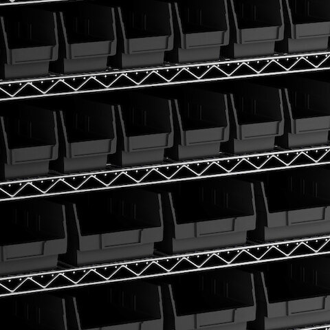 - Includes 12 shelves, 4 posts, and 118 black polypropylene bins