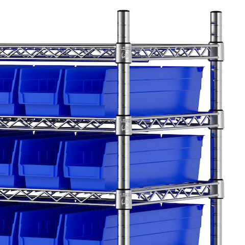 The NSF shelving unit is made of a durable, chrome-plated metal with a clear epoxy coating. It includes 12 shelves, 4 posts, and 118 blue injection-molded polypropylene bins, all of which are made to commercial-grade specifications to withstand industrial conditions and for your business's long-lasting use. Each shelf can hold up to an impressive 450 lb. of evenly distributed weight.