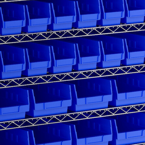 - Includes 12 shelves, 4 posts, and 118 blue polypropylene bins