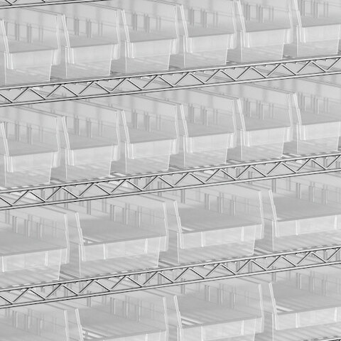 - Includes 12 shelves, 4 posts, and 118 clear polypropylene bins