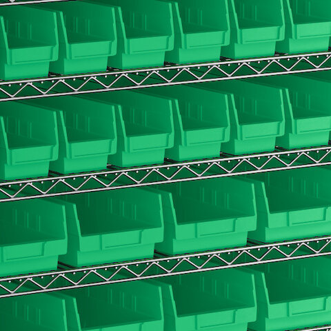 - Includes 12 shelves, 4 posts, and 118 green polypropylene bins
