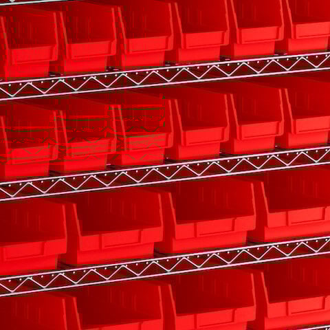 - Includes 12 shelves, 4 posts, and 118 red polypropylene bins