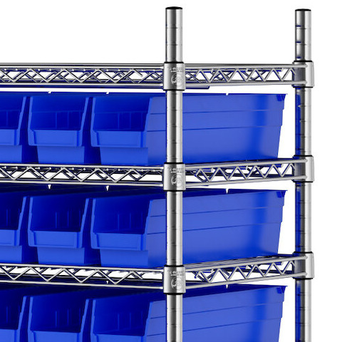 The NSF shelving unit is made of a durable, chrome-plated metal with a clear epoxy coating. It includes 12 shelves, 4 posts, and 143 blue injection-molded polypropylene bins, all of which are made to commercial-grade specifications to withstand industrial conditions and for your business's long-lasting use. Each shelf can hold up to an impressive 450 lb. of evenly distributed weight.