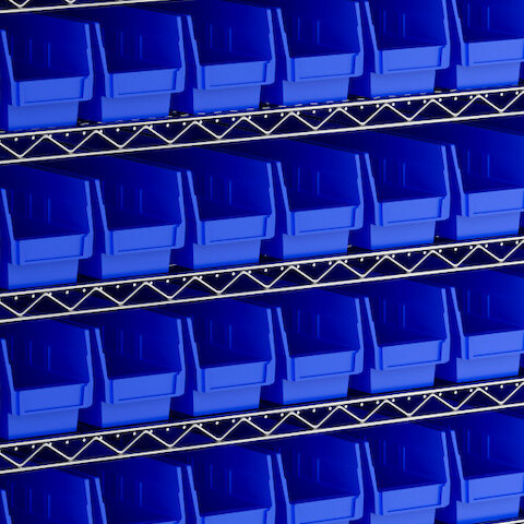 - Includes 12 shelves, 4 posts, and 143 blue polypropylene bins