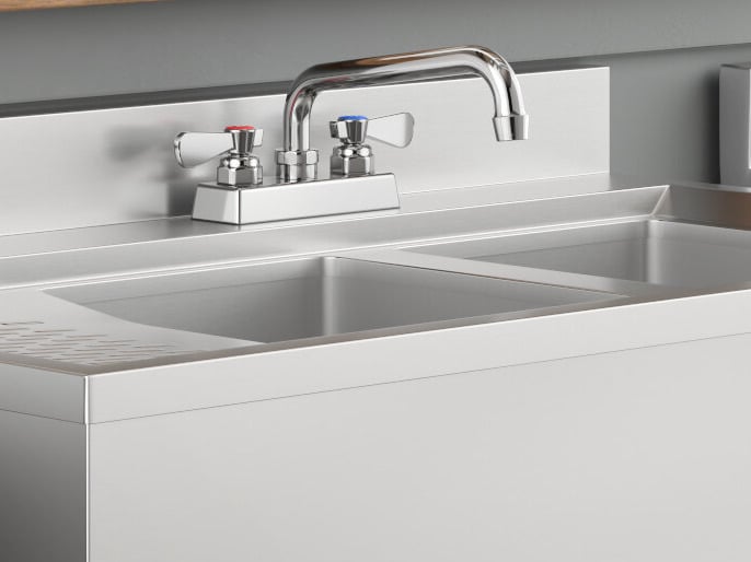 This sink's faucet includes (2) 1/2" NPS inlets and boasts a 10" swing spout that releases water through a 2 GPM aerator, creating a soft flow pattern with minimal splashing. This unit features (2) 2" drains with drain baskets included.