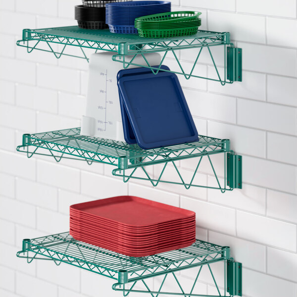 For reliable and convenient wall-mount storage, this Regency wire shelf is an excellent choice! Perfect for a variety of commercial applications, it features a green epoxy coating, making it suitable for dry, moist, or humid environments.