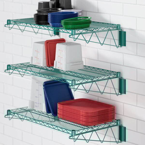 For reliable and convenient wall-mount storage, this Regency wire shelf is an excellent choice! Perfect for a variety of commercial applications, it features a green epoxy coating, making it suitable for dry, moist, or humid environments.