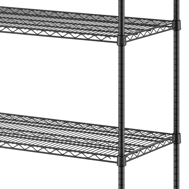 This NSF black epoxy shelf kit includes (4) 21" x 60" wire shelves and (4) 64" posts, each with a sleek black color and simple, professional design. It provides a convenient storage solution with a classic look that's excellent for use in retail environments. The shelf is also ideal for use in janitorial closets, warehouses, walk-in coolers, or dry storage areas.