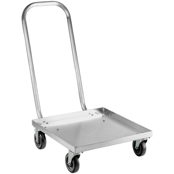 Perfect for any food service establishment, banquets, and catering, this Regency 23 3/16" x 23 3/16" aluminum dolly with handle offers long-lasting durability and versatility. Plus, its convenient design allows for effortless transport of a standard 20" x 20" dish rack, ice buckets, or stackable glass rack, making this dolly a welcome addition for your catering and serving staff!
