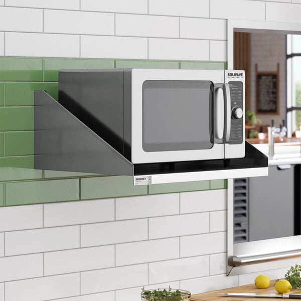 Regency 24" x 18" Stainless Steel Microwave Shelf is made very well held our microwave with ease. just make sure you mount on wall studs