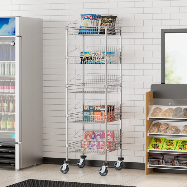 View All ItemsStore and display items in your grocery store, retail store, or hardware store using this Regency 24" wide chrome mobile 5 basket retail storage display stand!