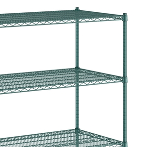 This kit boasts a green epoxy coated wire construction that works well in back-of-house storage and supply areas. Since it resists corrosion from humidity, this shelving unit is a great choice for walk-in coolers, storage rooms, or dish rooms. Its wire shelves do a great job of facilitating proper air flow around your stored supplies, helping to prolong the shelf life of food.