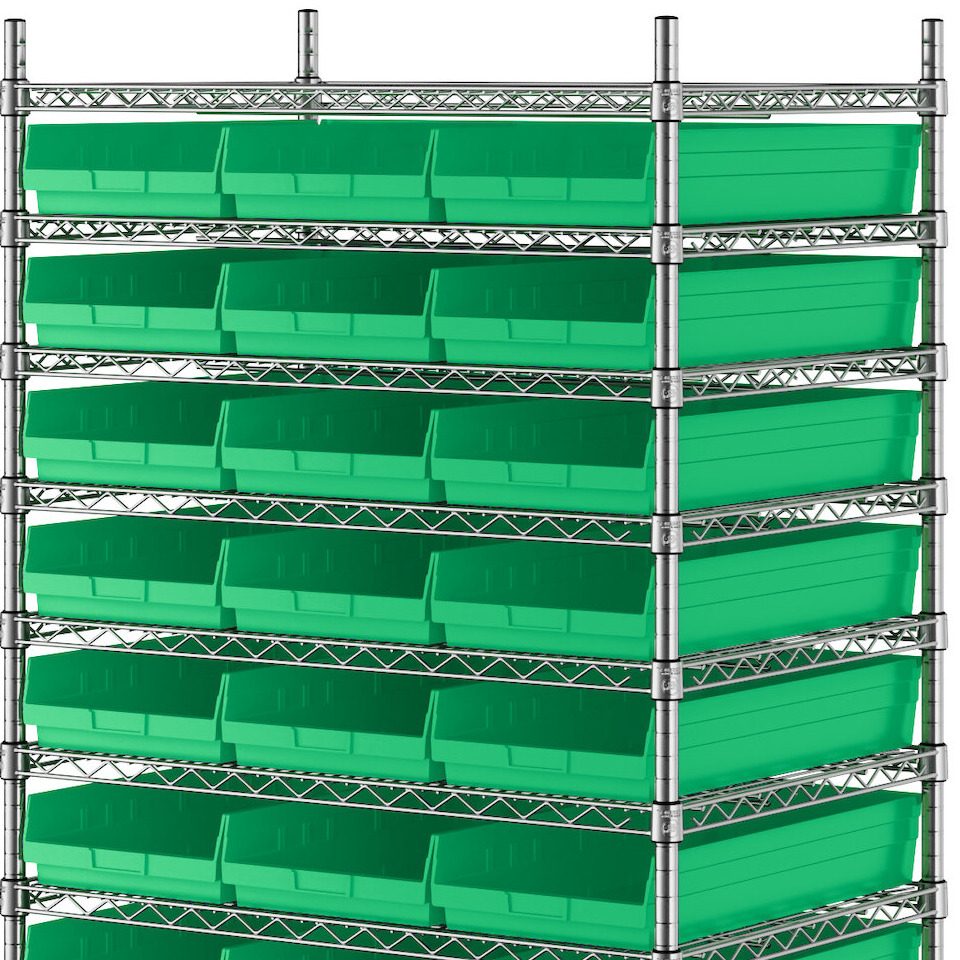 - Includes 12 shelves, 4 posts, and 33 green polypropylene bins