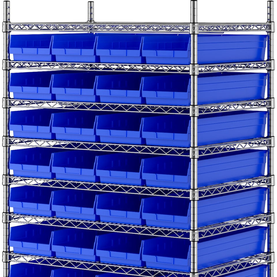 The NSF shelving unit is made of a durable, chrome-plated metal with a clear epoxy coating. It includes 12 shelves, 4 posts, and 44 blue injection-molded polypropylene bins, all of which are made to commercial-grade specifications to withstand industrial conditions and for your business's long-lasting use. Each shelf can hold up to an impressive 600 lb. of evenly distributed weight.