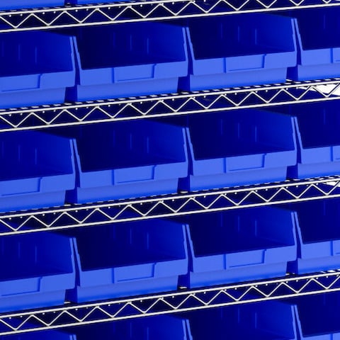 - Includes 12 shelves, 4 posts, and 44 blue polypropylene bins