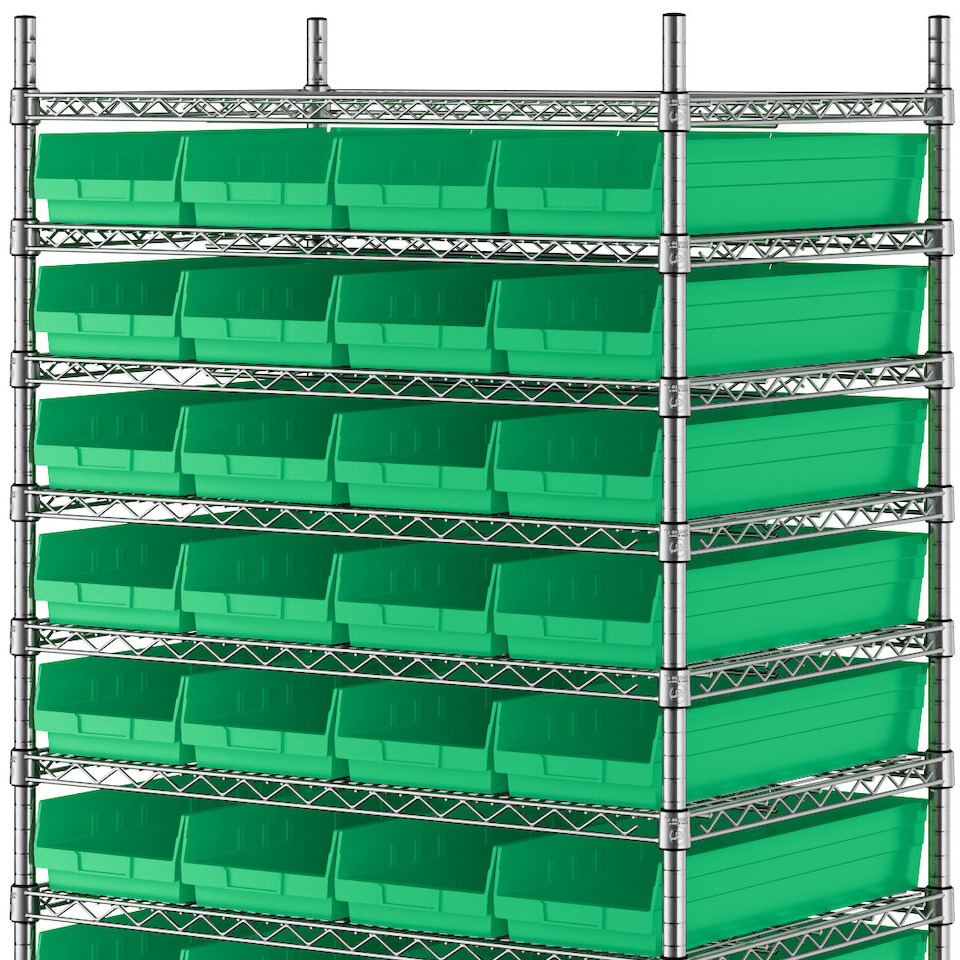 The NSF shelving unit is made of a durable, chrome-plated metal with a clear epoxy coating. It includes 12 shelves, 4 posts, and 44 green injection-molded polypropylene bins, all of which are made to commercial-grade specifications to withstand industrial conditions and for your business's long-lasting use. Each shelf can hold up to an impressive 600 lb. of evenly distributed weight.