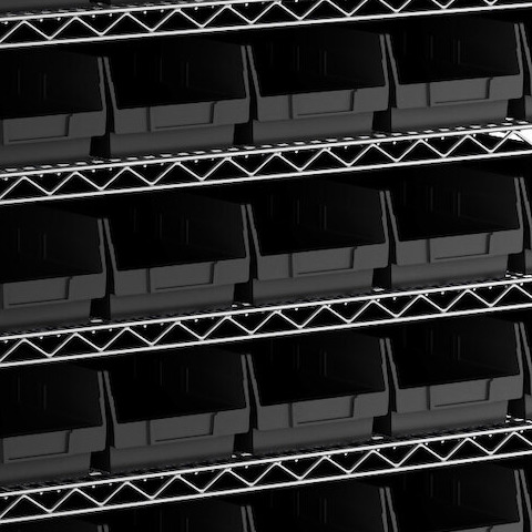 - Includes 12 shelves, 4 posts, and 55 black polypropylene bins