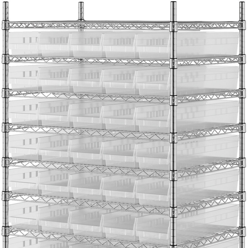 The NSF shelving unit is made of a durable, chrome-plated metal with a clear epoxy coating. It includes 12 shelves, 4 posts, and 55 clear injection-molded polypropylene bins, all of which are made to commercial-grade specifications to withstand industrial conditions and for your business's long-lasting use. Each shelf can hold up to an impressive 600 lb. of evenly distributed weight.