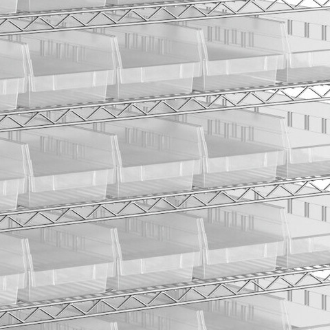 - Includes 12 shelves, 4 posts, and 55 clear polypropylene bins