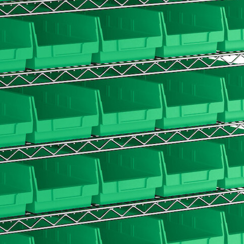 - Includes 12 shelves, 4 posts, and 55 green polypropylene bins