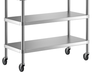 The undershelf and overshelf use type 430 stainless steel. Type 304 stainless steel is used on the work table, which provides extra durability where it's needed most, while giving extra protection against rust and corrosion. The kit comes unassembled, but is easy to put together thanks to the simple and intuitive set screw installation. And to make your table mobile, it comes with a set of 5" casters (2 with brakes). Hardware for mounting the overshelf to the table is sold separately.