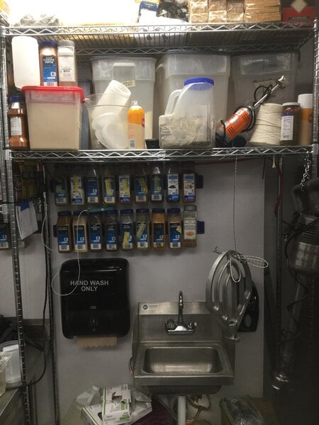 All restaurants can never have enough storage. Whether it is shelving like this, or standard wall mounted shelves you can never seem to have enough.