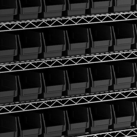 - Includes 12 shelves, 4 posts, and 110 black polypropylene bins