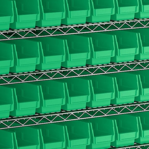 - Includes 12 shelves, 4 posts, and 110 green polypropylene bins