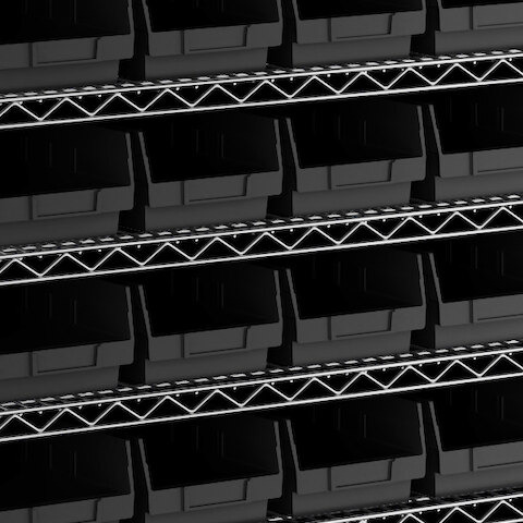 - Includes 12 shelves, 4 posts, and 66 black polypropylene bins