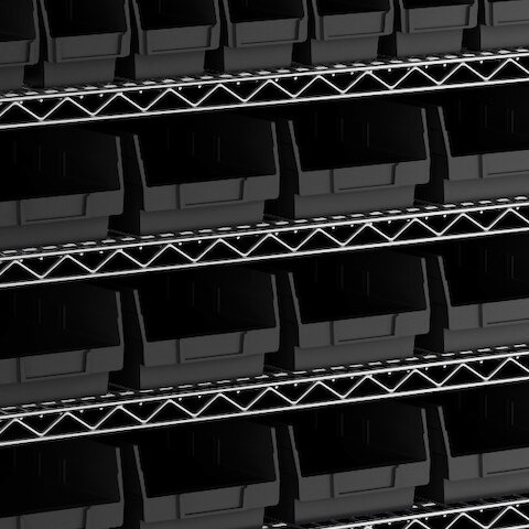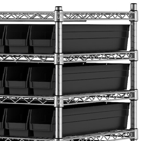 • Includes 12 shelves, 4 posts, and 91 black polypropylene bins