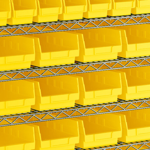 - Includes 12 shelves, 4 posts, and 91 yellow polypropylene bins